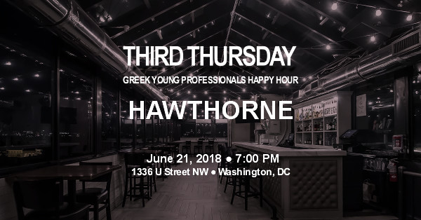 Third Thursday Greek Young Professionals Happy Hour Join us on Thursday, June 21, 2018 at 7:00 PM as the Third Thursday Greek Young Professionals Happy Hour series renews its love affair with rooftop bars at Hawthorne Rooftop Tavern on U Street in Washington, DC! Hawthorne is famous for having one of the best rooftops in the DC area with views of the Washington Monument and the U.S. Capitol. Hawthorne Getting There Driving Directions See you there, Aristotelis Chronis | Themistocles Chronis | Maria George | Sofia Plagakis If you have a suggestion on where the next Third Thursday should be, email us at [email protected], join our Facebook group. We would love to hear from you! Since 2001, Third Thursday has provided Greek-Americans, Greeks, Cypriots, and Philhellenes from the Washington, DC area and beyond the chance to meet every month in a relaxed atmosphere, particularly welcoming those who have moved from different parts of the country for work or school into the greater DC area Greek community. With visits to a variety of bars, restaurants, and lounges in the most vibrant neighborhoods of DC, Maryland, and Virginia, Third Thursday is a great way to catch up with old friends and make new ones in the Greek community. We strive to maintain the simple principles of its founders while expanding the event to an ever-changing audience of Greeks in the area. We look forward to seeing you -- or meeting you for the first time -- at the next Third Thursday.
