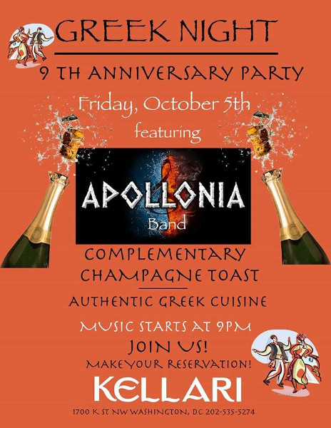wine, live Greek music and dancing as Kellari's Monthly Greek Night returns from its summer hiatus with its 9th Anniversary Party and a special appearance by Apollonia!