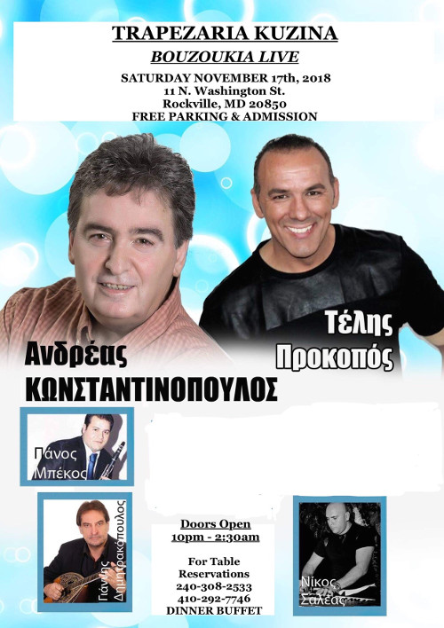 Bouzouki: Γιαννης Δημητρακοπουλος Keyboards: Νικος Σαλεας Saturday, November 17, 2018 10:00 PM - 2:30 AM Tables Limited. For Reservations Call: (240) 308-2533