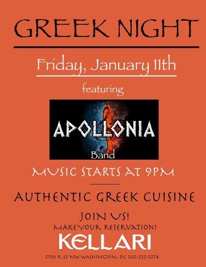 Friday, January 11, 2019 Join us on Friday, January 11, 2019 for a memorable night with authentic Greek food, wine, live Greek music by Apollonia and dancing at the January 2019 edition of Kellari's monthly Greek Night! Choose from a full menu of authentic Greek dishes and Wine Spectator award-winning Greek and imported wine list while you enjoy traditional Greek music starting at 9:00 PM. Dinner reservations are encouraged or come for drinks at the bar with scores of Greek young professionals. For those of you attending DCGreeks.com Night with the Washington Wizards 2019, join us after the game and show us your ticket for a free drink! Those of you taking the Metro from Capital One Arena can take the Red Line from Gallery Pl-Chinatown outside the arena to Farragut North!