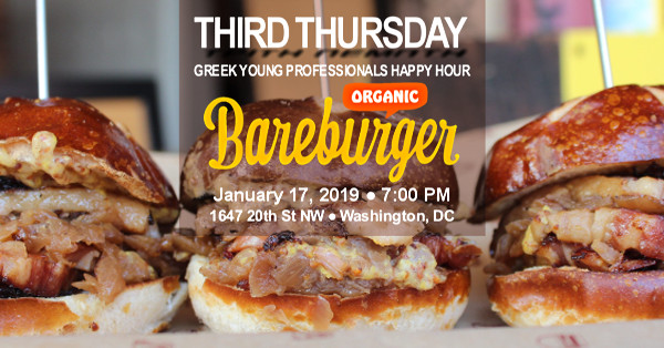 Join us on January 17, 2019 at 7:00 PM as Third Thursday celebrates our first happy hour of 2019 at Greek-owned Bareburger right in the heart of Dupont Circle. Prepare yourself for a night of organic burgers with everything from beef and turkey to bison, duck, boar, and elk (and even a couple of vegetarian options if you're into that sort of thing), along with a great selection of drinks, appetizers, and other offerings. Bareburger will be