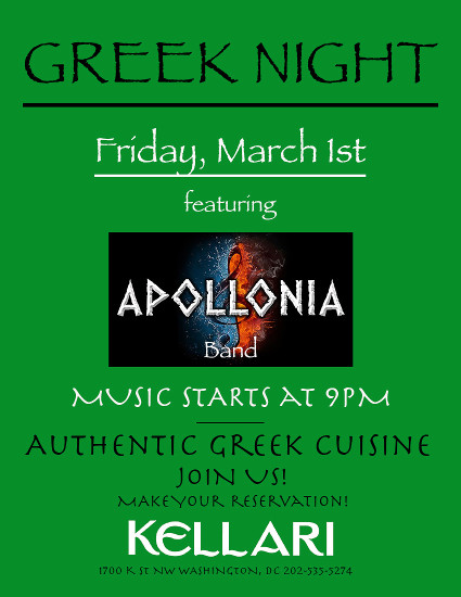 Greek music starting at 9:00 PM. Dinner reservations are encouraged or come for drinks at