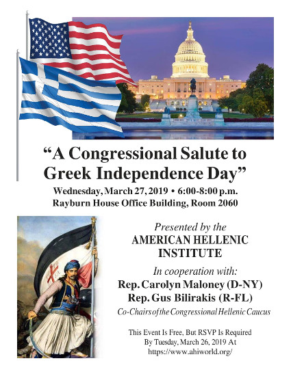 Wednesday, March 27, 2019 6:00 PM - 8:00 PM Rayburn House Office Building, Room 2060 Presented by The American Hellenic Institute In Cooperation with: Rep. Carolyn Maloney (D-NY) & Rep. Gus Bilirakis (R-FL) This event is free, but RSVP is required by Tuesday, March 26, 2019
