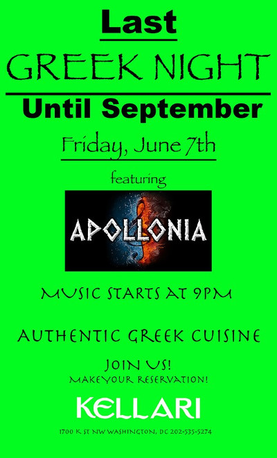 Greek music starting at 9:00 PM. Dinner reservations are encouraged or come for drinks at