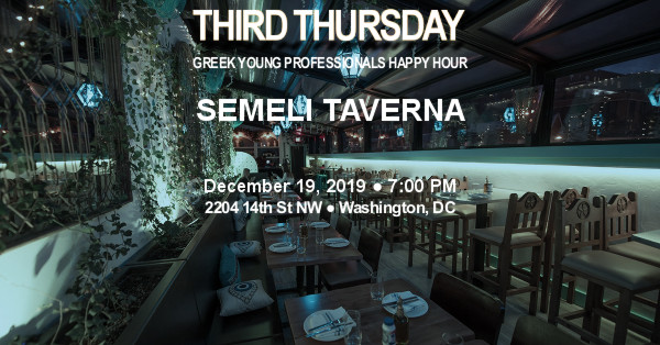 Join us on Thursday, December 19, 2019 at 7:00 PM as the Third Thursday Greek Young Professionals Happy Hour series visits newly opened Semeli Taverna on 14th St NW in Washington, DC. Located on the rooftop of Sakerum, owner Stephanos Andreou (Sakerum, Barcode) pays tribute to his Cypriot upbringing with a new offering named after his mother. Semeli Taverna is a Greek Oasis serving a Mezze style meal with 14 plates promising guests a culinary journey through Greece & Cyprus. We've secured extended food and drink specials off their Happy "Opa" Hour all night, including assorted $7 plates, a $15 Semeli Platter, and $7 house wine and cocktails.