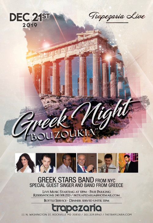 Trapezaria Live Greek Night Featuring Live Bouzoukia Straight from NYC by Greek Stars Band Special Guest Singer from Greece Saturday, December 21, 2019 10:00 PM Tables Limited. For Reservations Call: (240) 308-2533