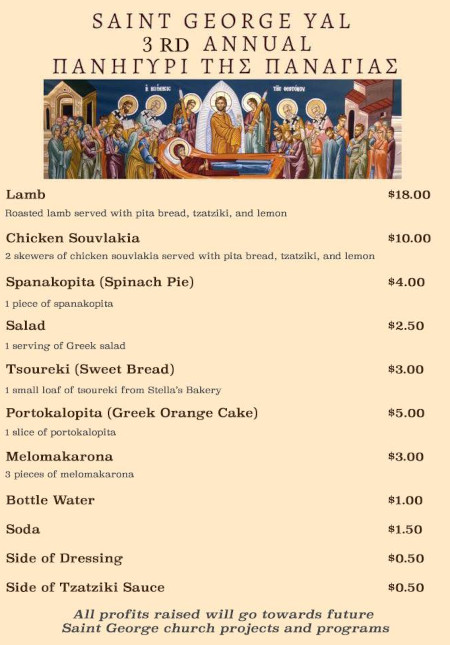 St. George YAL's 3rd Annual ΠΑΝΗΓΥΡΙ ΤΗΣ ΠΑΝΑΓΙΑΣ Please join the St. George community after church on Sunday, August 15, 201 to celebrate the Dormition of our most Holy Theotokos with a traditional Greek-style Panigiri (including Greek food, music, and dance)! Feel free to share this with family and friends and if there are any questions, please reach out to [email protected]. We look forward to seeing everyone! Note: Food will be sold on a first come, first serve basis and all profits made will go towards future St. George church projects and programs.