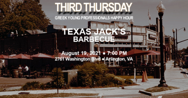 Join us on Thursday, August 19, 2021 starting at 7:00 PM as the Third Thursday Greek Young Professionals Happy Hour series continues in its quest for outdoor venues by visiting Texas Jack's Barbecue in Arlington, VA.  Located in the Clarendon, Greek owned Texas Jack's Barbecue features an expansive wrap-around patio where it serves succulent barbecue including beef short ribs, beef brisket, pulled pork, pork spare ribs, pork belly, turkey, homemade sausage and chicken, along with amazing cocktails, and an impressive variety of beers on tap.