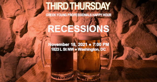 Join us on Thursday, November 18, 2021 starting at 7:00 PM as the Third Thursday Greek Young Professionals Happy Hour series visits Recessions in downtown DC. Recessions features happy hour specials that run until 8:00 PM which include $5 Appetizers (Onion Rings, Mini Crab Cakes, French Fries, Stuffed Potato Skins, Chicken Tenders, Mozzarella Sticks, Buffalo Wings, Fried Calamari, Nacho Platter, and Chicken Quesadillas), $3 Miller Lite, $4 Rail Drinks, and $5 King Kong 28 oz drafts. Come enjoy an evening of karaoke, billiards, darts, and arcade games with your fellow Greeks and Philhellenes!