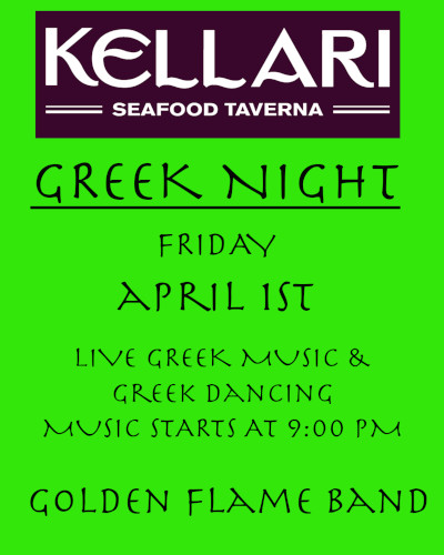 Join us on Friday, April 1, 2022 for a memorable night with authentic Greek food, wine, and dancing at the April 2022 edition of Kellari's Monthly Greek Night with live Greek music by Golden Flame!
