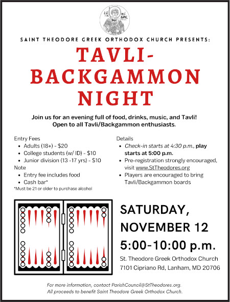 Saint Theodore Greek Orthodox Church Presents TAVLI-BACKGAMMON NIGHT Join us for an evening full of food, drinks, music, and Tavli! Open to all Tavli/Backgammon enthusiasts. SATURDAY, NOVEMBER 12, 2022 Details