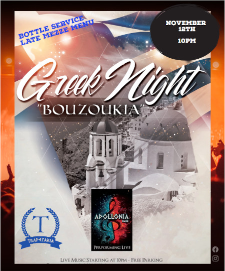 Trapezaria Live Greek Night Featuring Live Bouzoukia By Apollonia Saturday, November 12, 2022 Live Music from 10:00 PM - 2:00 AM Tickets: General Admission: $10/person