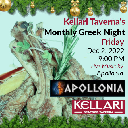 Friday, December 2, 2022 Join us on Friday, December 2, 2022 for a memorable night with authentic Greek food, wine, and dancing at the December 2022 edition of Kellari's Monthly Greek Night with live Greek music by Apollonia! Choose from a full menu of authentic Greek dishes and Wine Spectator award-winning Greek and imported wine list while you enjoy traditional Greek music starting at 9:00 PM. Dinner reservations are encouraged or come for drinks at the bar with scores of Greek young professionals.