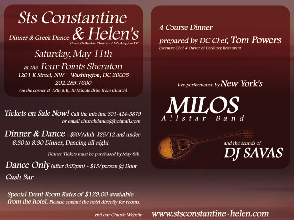 You are cordially invited to attend the… ANNUAL DINNER & GREEK DANCE of STS CONSTANTINE & HELEN GREEK ORTHODOX CHURCH of Washington, DC Event will be held Saturday, May 11th, 2002 at the Four Points Sheraton 1201 K Street, NW Washington DC 20005 (On the corner of 12th & K) A four course buffet dinner will prepared by DC Chef - Tom Powers Executive Chef & Owner of Corduroy Restaurant Live musical performance by New York’s THE MYLOS ALLSTAR BAND Accompanied by the sounds of DJ SAVAS Dinner & Dance $50 per Adult $25 per Child (12 and under) Dinner will be served from 6:30 to 8:30 Dinner Tickets must be purchased by May 8th Dance Only (Admittance only after 9:00 pm) $15 per person @ the Door Cash Bar (With proper ID) Special event room rate of $129.00 available from the hotel Please contact the hotel directly for rooms 202-289-7600 To purchase tickets please call the info line @ 301-424-3879 Or email us - [email protected] Visit http://www.stsconstantine-helen.com for details. Event sponsored by... *Normandie Farm Restaurant* 10710 Falls Road Potomac, MD 20854 For reservations call 301-983-8838 or visit www.popovers.com and supported by... *Panorama Productions and “To Glenti” Greek Events* For info visit www.panoramai.com or www.toglenti.com *Sigma Entertainment and “Envy” Greek Events* For info visit www.sigma-entertainment.com *Greek Music CD’s and “Asteria Productions”* For more info visit www.gmcds.com *DCGreeks.com, the independent source of information on the Washington, DC Greek Community!*