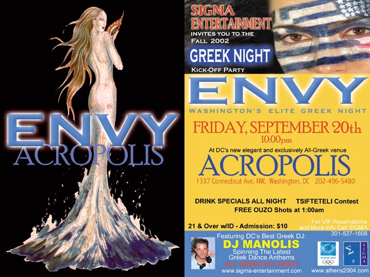For the past few months Sigma Entertainment has been bringing you the most exciting and full of Kefi Greek Nights at the ACROPOLIS nightclub. Once again we have teamed up with DC’s newest venue, Acropolis to continue Washington’s Elite Greek Night: E N V Y Come and party with Greeks from the Washington DC Metro Area, as well as Baltimore, NYC, and Philadelphia as we all come together to experience a night of dance, style, and beauty at DC's new elegant and exclusively all Greek Venue A C R O P O L I S Please join Sigma Entertainment for the “FALL 2002 Greek Night Kick-Off Party” at E N V Y... DC's Elite Greek Night FRIDAY, SEPTEMBER 20th 10:00pm Complimentary Appetizers FREE OUZO Shots at 1:00am Drink Specials All Night Ladies, enter the TSIFTETELI Contest For your chance to win fabulous prizes and a day of pampering fit for a Greek Goddess Featuring DC’s Best Greek Night DJ: D J M A N O L I S Spinning the latest Greek Dance Anthems as heard this summer at the best nightclubs in Greece. For more info or VIP Room Reservations email [email protected] or call SIGMA @ 301.527.1608 www.sigma-entertainment.com www.greeknightlife.com (coming soon) 21 & Over - Admission: $10 ENVY Greek Night Party Mix CD Volume I (Coming Soon) Available exclusively online and at the ENVY Greek Nights ENVY is Located at ACROPOLIS 1337 Connecticut Ave., NW Washington, DC 20036 202-496-5480 To be removed from the GREEK NIGHT mail List please reply with 'remove' and include your email address. To add a friend to the GREEK NIGHT Email List, please go to: http://www.sigma-entertainment.com/contact.shtml