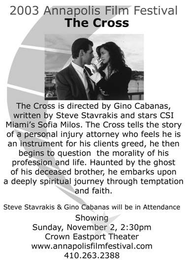 Director: Gino Cabanas Producers: Gino Cabanas, Kim Swartz Writers: Gino Cabanas, Steve Stavrakis Cinematographer: Massimo Zeri Principal Cast: Steve Stavrakis, Gino Cabanas, Sofia Milos(CSI Miami ) When a personal injury attorney feels he is only an instrument for his clients greed, he begins to question the morality of his profession and life. Haunted by the ghost of his deceased brother, he embarks upon a deeply spiritual journey through temptation and faith. Greek Filmmaker Gino Cabanas is Coming to Annapolis 20 year veteran Gino Cabanas will be coming to Annapolis from Los Angeles for the Mid-Atlantic premier of his award winning film The Cross. He will be available for Q&A immediately after the showing of his dramatic film that centers around the Epiphany. The screening will take place at the Annapolis Film Festival Sunday November 2, 2:30pm at the Crown Eastport Theater. Meet the Director and enjoy this extraordinary film that explores one man’s search for faith. The Cross is directed by Gino Cabanas, written by Steve Stavrakis and stars CSI Miami’s Sofia Milos. The Cross tells the story of a personal injury attorney who feels he is an instrument for his clients greed, he then begins to question the morality of his profession and life. Haunted by the ghost of his deceased brother, he embarks upon a deeply spiritual journey through temptation and faith. The Festival is set to take place over Halloween weekend, October 31 – November 2, 2003. Documentary, Short and Feature Filmmakers from all over the country are preparing to descend upon Annapolis to screen their award winning and premiere films at Crown Eastport Theaters and The Annapolis Cinema Grill. Wendy Rieger will kick-off the Festival Opening Night with the unreleased film “In America”, which is sure to be another Academy Award Winning Film for Jim Sheridan(My Left Foot, In the Name of the Father). Opening night will be completed with a Masquerade Ball immediately following the film at Maryland Hall for the Creative Arts.