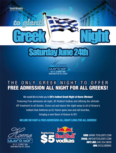 Panorama Productions would like to invite you to DC’s Hottest Monthly Greek Night at Home Nightclub! Now under complete Greek ownership and Management! Saturday, June 24 @ Home Nightclub The Only Greek Night to Offer Free Admission All Night to All Greeks!!! Featuring DJ Yianni spinning the latest and hottest Greek Anthems straight from the dance floors of Drink Specials: $5 Vodka Red Bulls Online Flyer: http://www.dcclubbing.com/emails/home_greeknight/ 21 and over