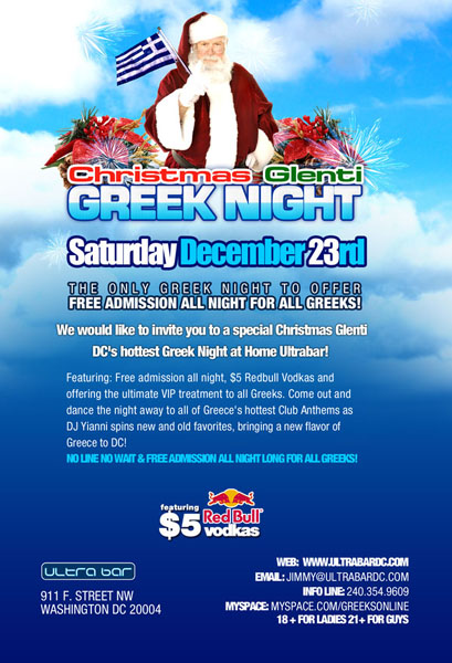 Panorama Productions would like to invite you to a Special Christmas Glenti and DC’s Hottest Greek Night at Home Ultra Bar! Featuring Free Admission all night, $5 Red Bull Vodkas, and offering the ultimate VIP treatment to all Greeks! Come out and dance the night away to all of Greece's hottest Club Anthems as DJ Yianni spins new and old favorites, bringing a new flavor of Greece to DC!