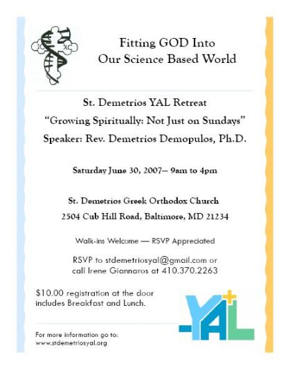 St. Demetrios YAL Retreat “Growing Spiritually: Not Just on Sundays” Speaker: Rev. Demetrios Demopulos, Ph.D. Saturday June 30, 2007— 9am to 4pm St. Demetrios Greek Orthodox Church 2504 Cub Hill Road, Parkville, MD 21234 Fitting GOD Into Our Science Based World $10.00 registration at the door includes Breakfast and Lunch. For more information go to: Walk-ins Welcome — RSVP Appreciated RSVP to [email protected] or call Irene Giannaros at 410.370.2263