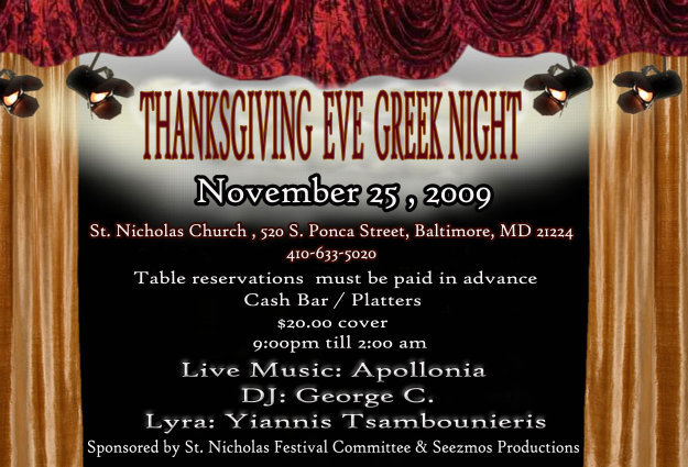 Thanksgiving Event Greek Night Wednesday, November 25, 2009 Featuring Live Music by Apollonia DJ George C. Lyra by Yiannis Tsambounieris Table Reservations must be paid in advance Cash Bar / Platters $20 Cover Sponsored by the St. Nicholas Festival Committee & Seezmos Productions