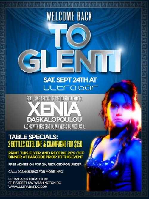 To Glenti Greek Night at ultrabar Saturday, September 24, 2011 Featuring Special Guest DJ/Music Producer from Greece DJ Xenia Daskalopoulou Along with To Glenti Resident DJs DJ MiXális & DJ Nikolas K. Table Specials: 2 Bottles of Ketel One Vodka & Champagne for $350 Special Pre-Party Dinner at BarCode