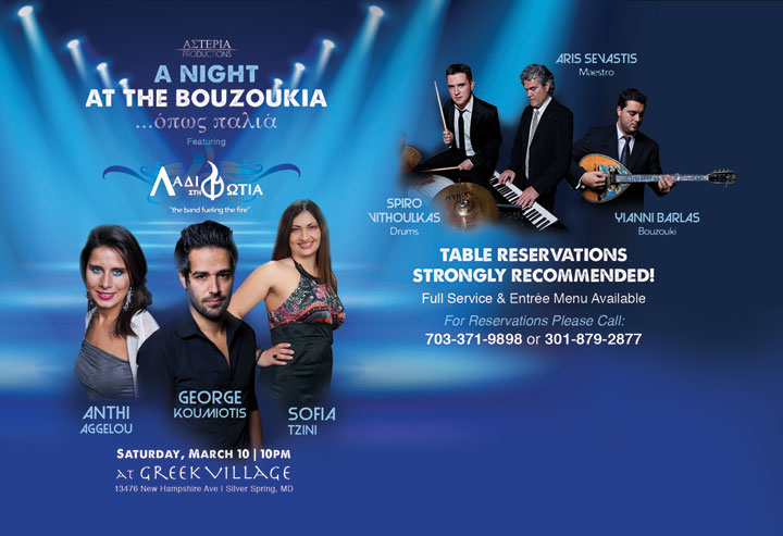 Asteria Productions presents A Night at the Bouzoukia Opos Palia Featuring live Greek music by Ladi Sti Fotia w/ Anthi Aggelou, George Koumiotis, Sofia Tzini & the Ladi Band