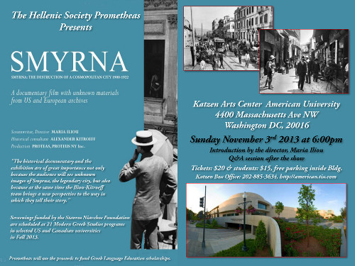Viewing of the Documentary and Q & A by Director Maria Iliou Presented by the Hellenic Society Prometheas The Hellenic Society Prometheas, invites you to a special screening of Smyrna: The Destruction of a Cosmopolitan City 1900-1922, a new documentary with unknown materials from US and European archives. This historical documentary and the exhibition are of great importance not only because the audience will see unknown images of Smyrna, the legendary city, but also because at the same time the Iliou-Kitroeff team brings a new perspective to the way in which they tell their story." Prometheas will use the proceeds to fund Greek Language Education scholarships. Tickets are $20 for adults, $15 for students and can be purchased online through American University's website. Abramson Family Recital Hall