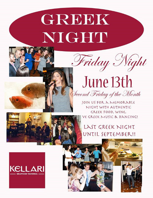 Join us on Friday June 13, 2014 for a memorable night with authentic Greek food, wine, live Greek music and dancing at Kellari's Last Greek Night until September!