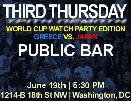 Join us on Thursday, June 19, 2014 at Public Bar in Dupont Circle at a special early start time of 5:30 PM as Third Thursday teams up with DCGreeks.com for a World Cup Watch Party for Greece's Group C match vs. Japan! The match starts at 6:00 PM, so we'll be there at 5:30 PM to stake out a place at one of DC's largest U-shaped bars. Public Bar features a massive 240" projection HDTV (the largest in the city) which will be tuned to the game with the sound on, creating a perfect atmosphere for cheering on Greece to victory! Public Bar is offering great food and drink specials during World Cup telecasts, including $3 Bud and Bud Light along with $4 Peroni.