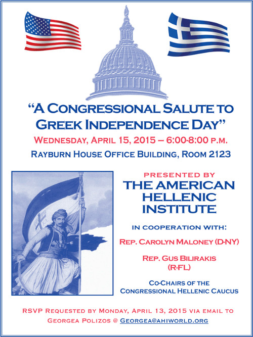 A Congressional Salute to Wednesday, April 15, 2015 6:00 PM - 8:00 PM Rayburn House Office Building, Room 2123 Presented by The American Hellenic Institute In Cooperation with: Rep. Carolyn Maloney (D-NY) & Rep. Gus Bilirakis (R-FL) RSVP Requested by Monday, April 13, 2015