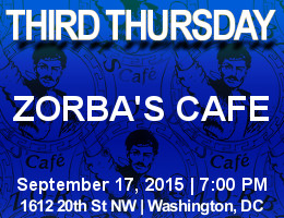Join us on Thursday, September 17, 2015 at 7:00 PM as Third Thursday kicks off its fall season at Zorba's Café in Dupont Circle.  Opened in 1984, Greek-owned and operated Zorba's Cafe features a huge selection of domested, imported and Greek beer and wine and a full menu of Greek favorites to be enjoyed on its charming outdoor patio.