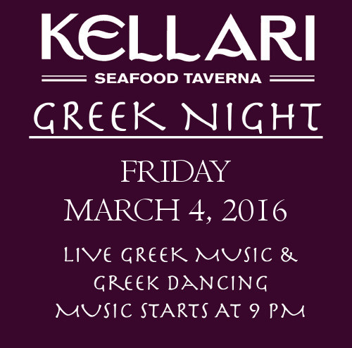 Join us on Friday, March 4, 2016 for a memorable night with authentic Greek food, wine, live Greek music and dancing at Kellari's Monthly Greek Night returns to the First Friday!