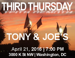 Join us on Thursday, April 21, 2016 at 7:00 PM to celebrate the return of warm weather at Tony & Joe's Seafood Place at Washington Harbour in Georgetown for this month's Third Thursday. Tony & Joe's features a spacious outdoor patio bar right on the Potomac River offering spectacular views of the Kennedy Center, Washington Monument, Roosevelt Island, and the Key Bridge.  The weather forecast for Third Thursday calls for a sunny 73 degree day, so that's where we'll be.