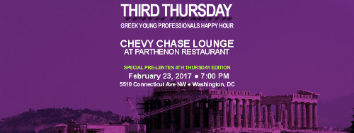 Join us on Thursday, February 23, 2017 at 7:00 PM for a Special Pre-Lenten 4th Thursday Edition of Third Thursday Greek Young Professionals Happy Hour at the Chevy Chase Lounge at Parthenon Restaurant.   Faced with the prospect of two straight months of early Third Thursdays across six more weeks of winter, we're betting that next week's weather will be more condusive to a better turnout.  The epitome of the neighborhood bar, the Chevy Chase Lounge has been a favorite locale for Greek happy hours throughout the years.  Hope to see you there.