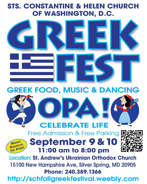 The 2017 Sts. Constantine and Helen Greek Festival is taking place on September 9, 2017 and September 10, 2017 at its temporary church location, St. Andrew Ukrainian Orthodox Cathedral, 15100 New Hampshire Avenue, Silver Spring, MD.