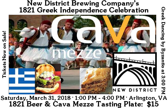 Following on our 1821 Greek independence celebration from last year, New District Brewing Company is partnering with Cava Mezze to give you a Cava tasting plate consisting of a Greek Lamb slider, hummus with pita, and a piece of honey drizzled baklava paired alongside our 1821 Beer for only $15.