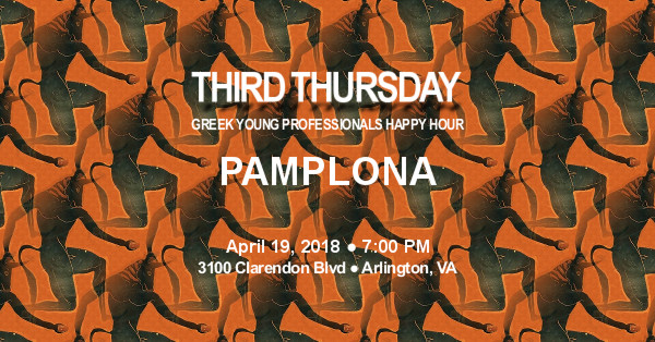 Third Thursday Greek Young Professionals Happy Hour Join us on Thursday, April 19, 2018 at 7:00 PM as the Third Thursday Greek Young Professionals Happy Hour series visits Pamplona in the Clarendon neighborhood of Arlington, VA! Open in early 2017, Pamplona is a Spanish tapas and sangria restaurant that draws its inspiration from Ernest Hemingway’s travels throughout the Basque region of Spain. Pamplona features an extended happy hour with $4 draft beers, $3 domestic bottles, $5 sangrias, and $7 signature cocktails. Pamplona Getting There Driving Directions See you there, Aristotelis Chronis | Themistocles Chronis | Maria George | Sofia Plagakis If you have a suggestion on where the next Third Thursday should be, email us at [email protected], join our Facebook group. We would love to hear from you! Since 2001, Third Thursday has provided Greek-Americans, Greeks, Cypriots, and Philhellenes from the Washington, DC area and beyond the chance to meet every month in a relaxed atmosphere, particularly welcoming those who have moved from different parts of the country for work or school into the greater DC area Greek community. With visits to a variety of bars, restaurants, and lounges in the most vibrant neighborhoods of DC, Maryland, and Virginia, Third Thursday is a great way to catch up with old friends and make new ones in the Greek community. We strive to maintain the simple principles of its founders while expanding the event to an ever-changing audience of Greeks in the area. We look forward to seeing you -- or meeting you for the first time -- at the next Third Thursday.