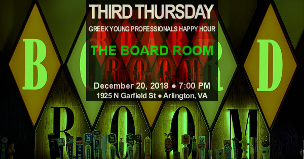Join us on Thursday, December 20, 2018 at 7:00 PM as the Third Thursday Greek Young Professionals Happy Hour celebrates Christmas at the Virginia location of The Board Room in the Clarendon neighborhood of Arlington! Located on the corner of SW corner of 10th Street N and Washington Blvd, The Board Room features an assortment of beers, a rotating list of wines, and a fully loaded craft cocktail menu to go along with a game closet full of games from every era (with a bring you own board game policy)! Happy Hour runs until 8:00 PM and features $1 off Port City Porter & Star Hill The Love, $2 off all Board Room Brews, $8 Board Room Brew Flights (4- 6 oz. pours), $5 house wines (red, white, rosé & sparkling), $5 Warm Pretzel, $8 BR Dip Platter and $10 Chicken Wings dishes.