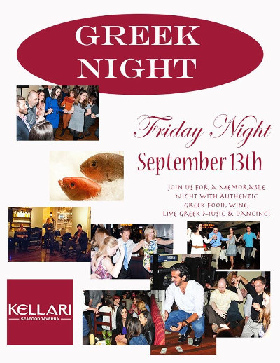 Join us on Friday, September 13, 2019 for a memorable night with authentic Greek food, wine, and dancing as Kellari's Monthly Greek Night returns from its summer hiatus with live Greek music by Golden Flame!
