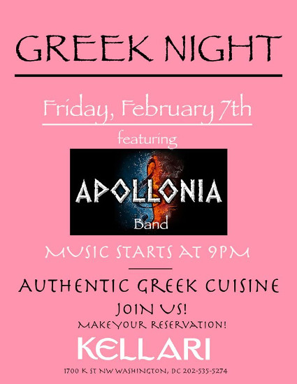 Join us on Friday, February 7, 2020 for a memorable night with authentic Greek food, wine, and dancing at Kellari's Monthly Greek Night with live Greek music by Apollonia!