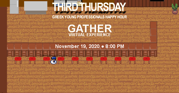 Join us on Thursday, November 19, 2020 at 8:00 PM as the Third Thursday Greek Young Professionals Happy Hour series continues online in DCGreeks.com's Virtual Bar!  With the social distancing protocols in place due to COVID-19, we're continuing with a virtual format via Gather, a video conferencing platform that better mimics a happy hour experience from the comfort of your home!