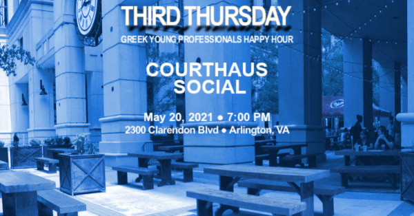Join us on Thursday, May 20, 2021 at 7:00 PM as the Third Thursday Greek Young Professionals Happy Hour series returns for the first time in real life since February 2020. We've chosen Courthaus Social in the Court House neighborhood of Arlington, VA, due to its spacious outdoor patio and Virginia's more relaxed stance on gatherings at this time. With that said, early RSVPs are appreciated, as we are looking to reserve several tables together outside for our group, so people can move between tables, as congregating while standing is still not permitted. Please check back with us for any updates.