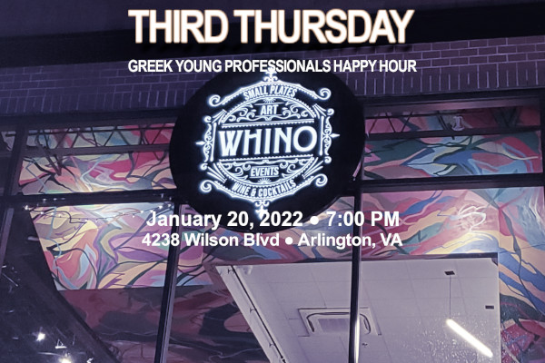Join us on Thursday, January 20, 2022 starting at 7:00 PM as the Third Thursday Greek Young Professionals Happy Hour series visits WHINO in the Ballston neighborhood of Arlington, VA. Located on the 2nd Floor of Ballston Quarter, this spacious newly-opened restaurant / art gallery features an open floor plan and a fantastic selection of craft cocktails, beer, wine and globally inspired social plates by Executive Chef Eleftherios Natas. With a collection of murals and other art adorning the space, this won't be your average Third Thursday venue, so make plans to attend.