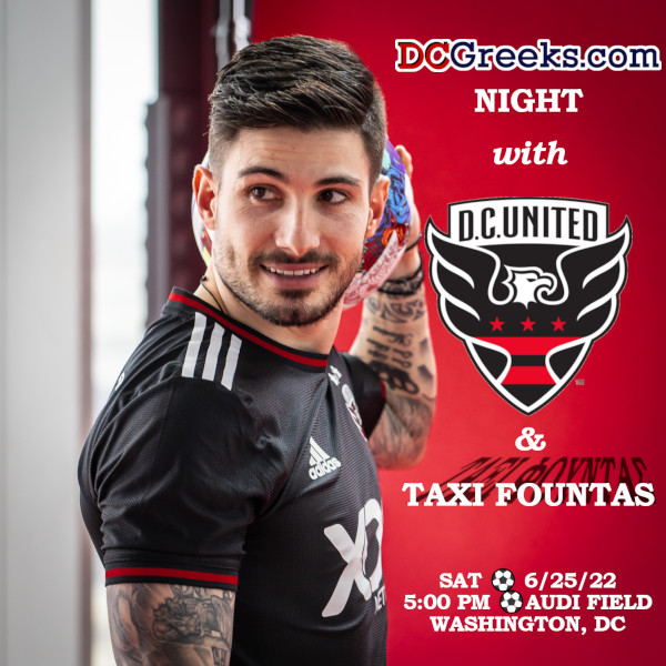DCGreeks.com invites you to Audi Field on Saturday, June 25, 2022 at 5:00 PM as D.C. United and Greek International Taxiarchis Fountas take on MLS rival Nashville SC.  Newly acquired Taxi Fountas has been with D.C. United since mid-April of this year and has taken MLS by storm, with five goals and three assists in his first seven matches with the club!