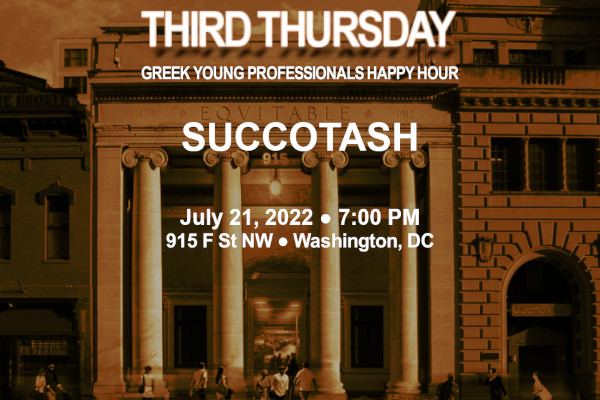 Join us on Thursday, July 21, 2022 starting at 7:00 PM as the Third Thursday Greek Young Professionals Happy Hour series visits Succotash in Washington, DC! Succotash is located in the historic Equitable Building which opened in 1912, housing the Equitable Co-Operative Building Association as well as such nightclubs as Fifth Column and Platinum. Succotash features a progressive perspective on classic Southern favorites, with James Beard Award winner, Chef Edward Lee, bringing his Korean roots and Southern repertoire to a soulful Southern menu. Their happy hour menu runs until 8:00 PM and features wine starting at $7, bottled and draft beers from $4-$6, and punches and sangria at $7-$8.
