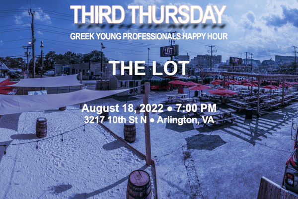 Join us on Thursday, August 18, 2022 starting at 7:00 PM as the Third Thursday Greek Young Professionals Happy Hour series visits The Lot in Arlington, VA! Located in Clarendon, The Lot is a 22,000-sq ft, sprawling outdoor venue with container bars, food trucks, yard games, cabanas, a rooftop lounge, games, sand area, and entertainment -- really something for everyone! Their drink menu features a large selection of draft, canned, and bottled beer, available individually or in pitchers/buckets, seasonal specials, frozen drinks, and wine!