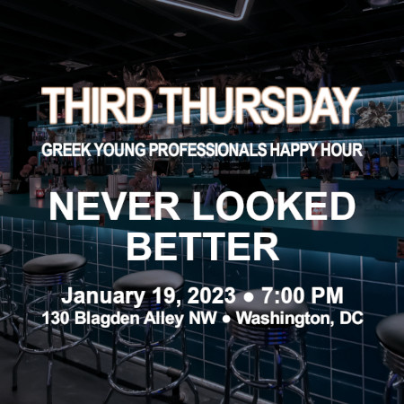 Join us on Thursday, January 19, 2023 starting at 7:00 PM as the Third Thursday Greek Young Professionals Happy Hour series visits Never Looked Better in Washington, DC. Located in an alley in Mt. Vernon Square, Never Looked Better celebrates the underground rave culture from the late '90s by bringing it into the modern era with updates to classic '90s martinis, cocktails, highballs, shooters, and more!