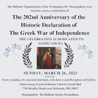 We mark the 202nd year since Greece's declaration of independence from Ottoman Turkish rule. Greeks and Philhellenes gather on this solemn, yet joyous, occasion to remember our ancestors' sacrifices in defeating the tyranny of slavery. They protected and preserved the ideals of Greece, the birthplace of Freedom and Democracy. Greek Independence Day is celebrated in every corner of the world and we bear the responsibilities as our Greek and Philhellenic forefathers did to further this legacy. We welcome one and all -- especially, our children, inheritors of our traditions and future guarantors of these ideals.