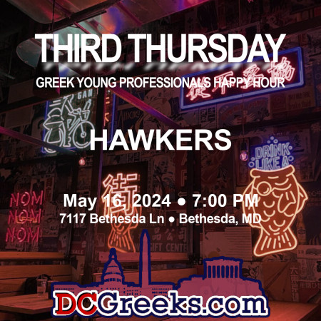 Third Thursday Greek Young Professionals Happy Hour Join us on Thursday, May 16, 2024 at 7:00 PM as the Third Thursday Greek Young Professionals Happy Hour series visits Hawkers in Bethesda, MD. Located in Bethesda Row, Hawkers Bethesda is a vibrant Asian street food restaurant, with a wide selection of craft cocktails, saké, Japanese whisky, beer, wine, and more!