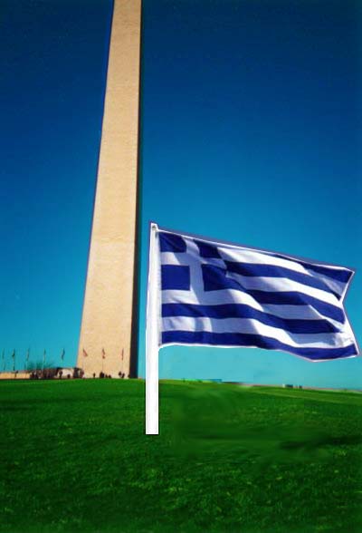 an oversized Greek flag on the grounds of the Washington Monument around 9:00